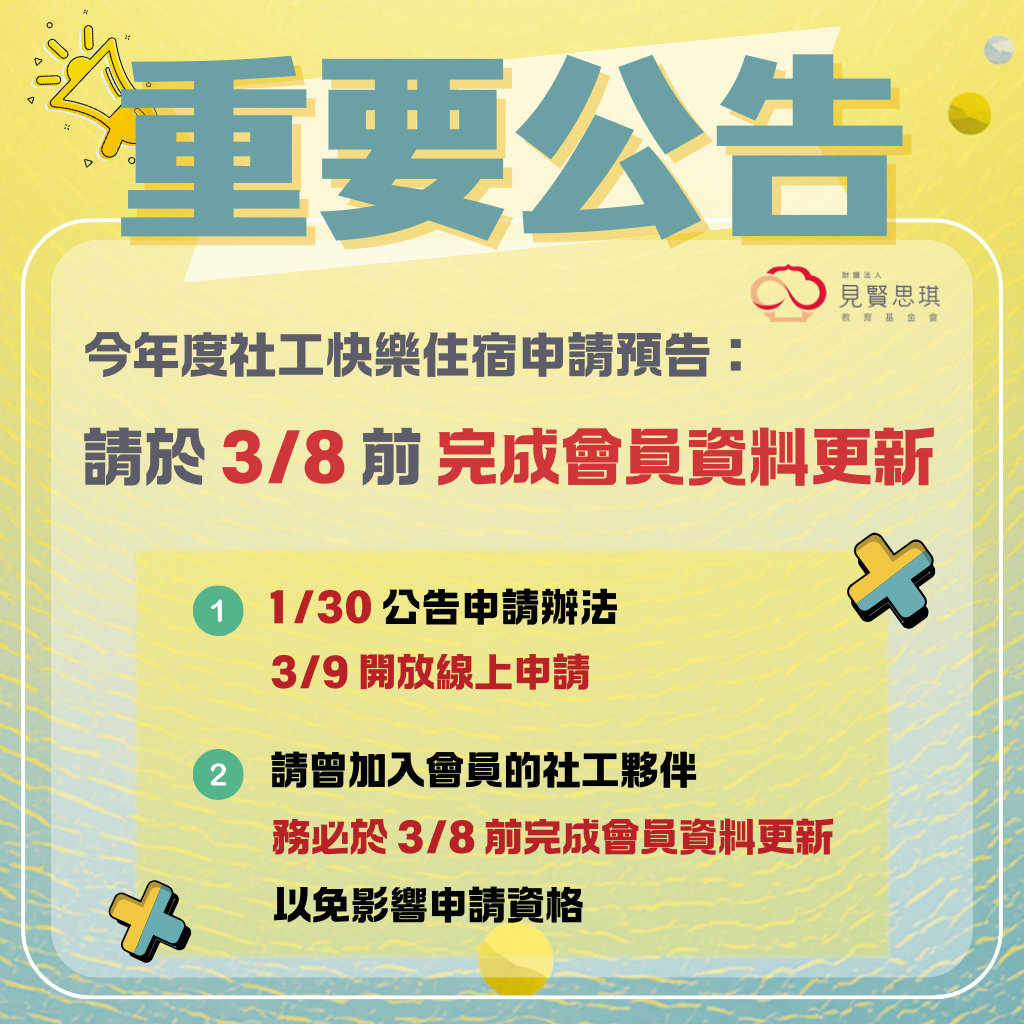 「2026年度社工快樂住宿」申請預告:本會將於1/30 公告申請辦法,3/9 開放線上申請。請曾加入會員的社工夥伴,務必於 3/8 前完成會員資料更新,以免影響申請資格。