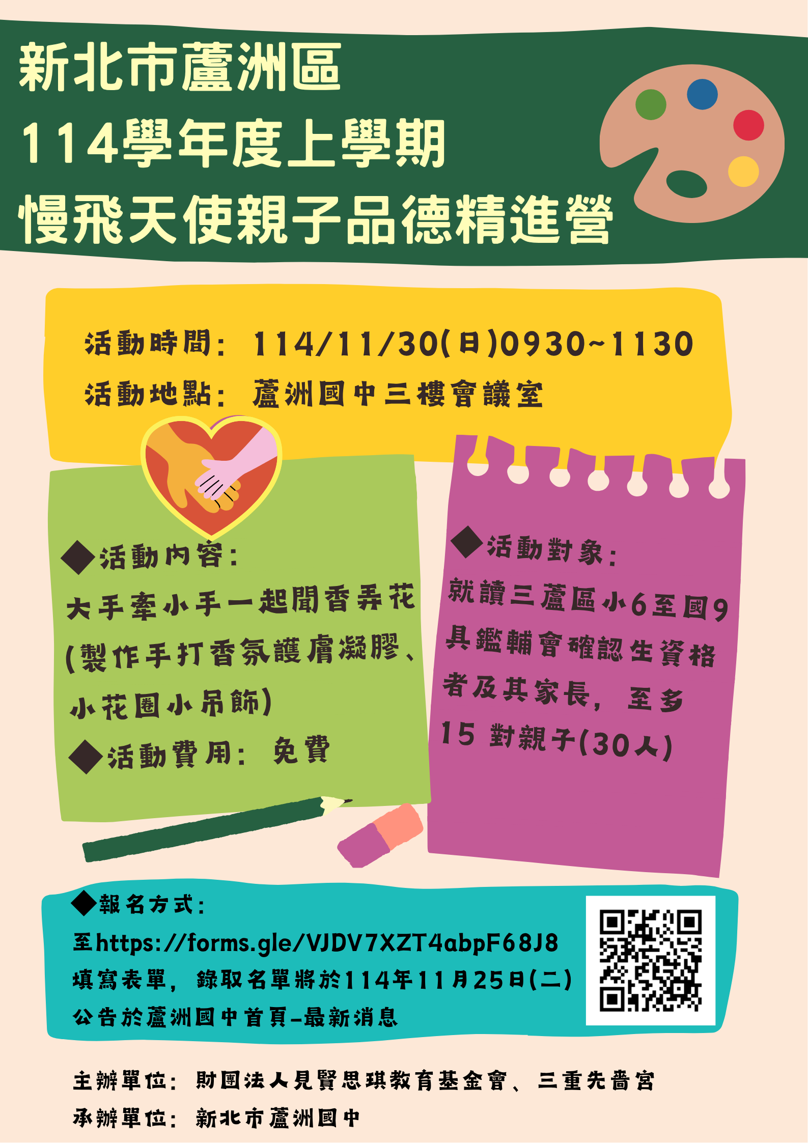 11/30(日)慢飛天使品德精進營,由蘆洲國中與見賢思琪教育基金會合辦,歡迎親子一同報名參加!