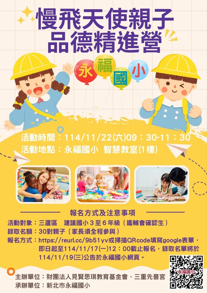 11/22(六)慢飛天使品德精進營由永福國小與見賢思琪教育基金會合辦,歡迎親子一同報名參加!