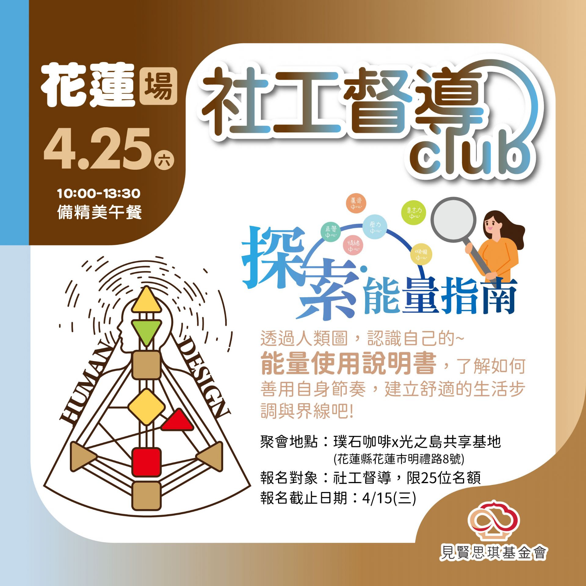 社工督導CLUB【花蓮場】探索.能量指南🔎📖透過人類圖,認識自己的「能量使用說明書」,了解如何善用自身節奏,建立舒適的生活步調與界線吧!